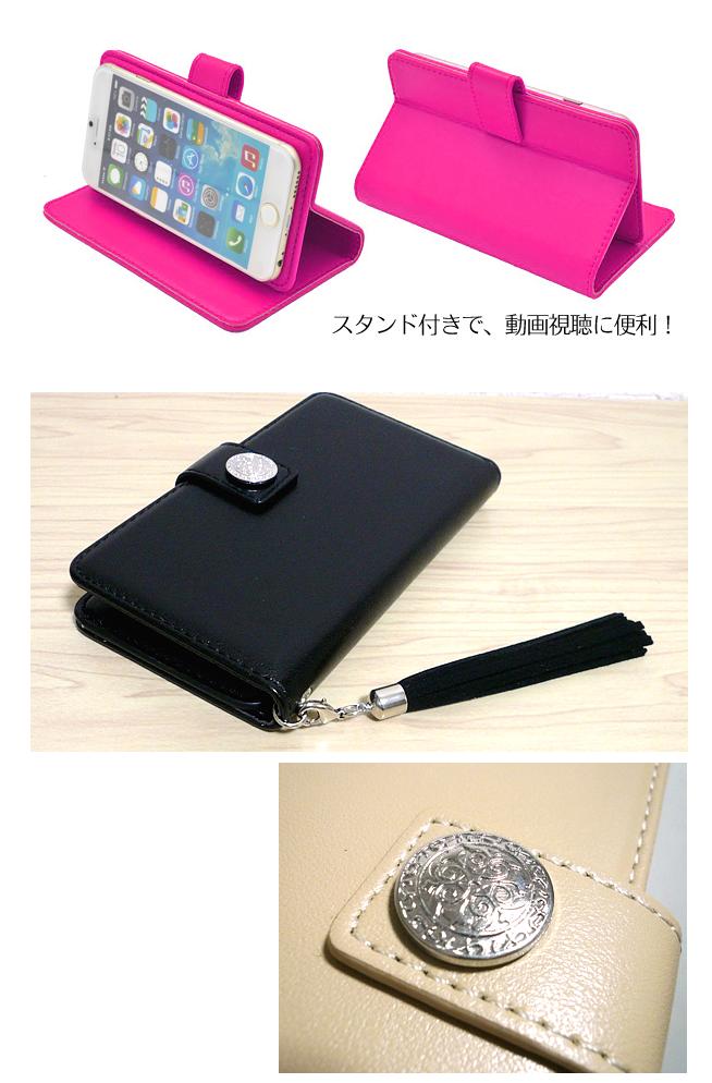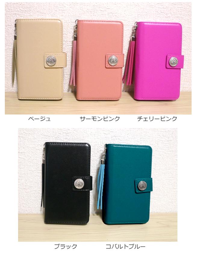 ギフト対応 素材 PUレザー、亜鉛合金(タッセル) サイズ 対応機種:縦142×横71×厚み10mm以下のスマートフォン タテ約14.5cm ヨコ約8.5cm タッセル:約12cm(金具含む) カラー ・サーモンピンク ・ベージュ ・チェリーピンク ・コバルトブルー ・ブラック(金具:シルバー) 特徴 貼り付けるだけの簡単装着!iPhone/Xperia/AQUOS PHONEなど各種スマホに使えるマルチタイプの手帳型スマホケースです。